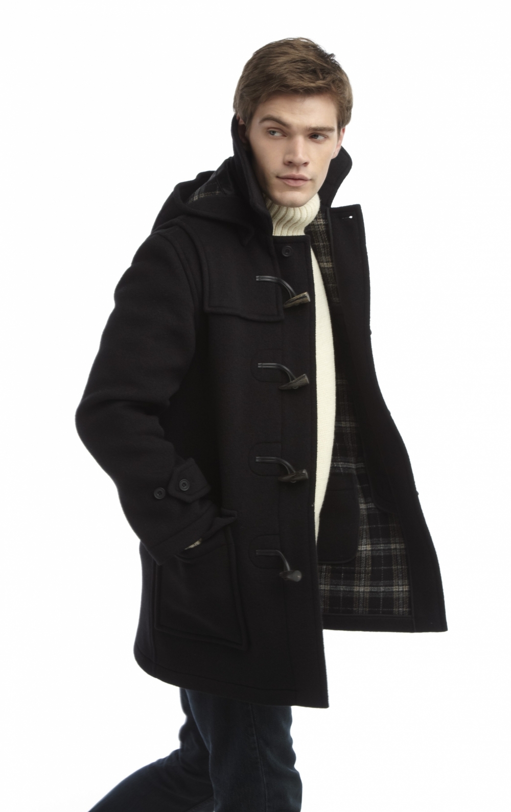 Model Original Montgomery London Duffle Coat Black różni się od klasycznych płaszczy dresowych dość wąskim krojem, odpinanym kapturem i dużym szerokim kołnierzem chroniącym szyję przed wiatrem i zimnem. Dodatkowo znajdziesz w nim wszystkie elementy charakterystyczne dla tradycyjnych wzorów tej odzieży wierzchniej: podłużne zapięcia z rogu, masywne skórzane pętle, dekoracyjne podszewki i bardzo pojemne kieszenie zewnętrzne.