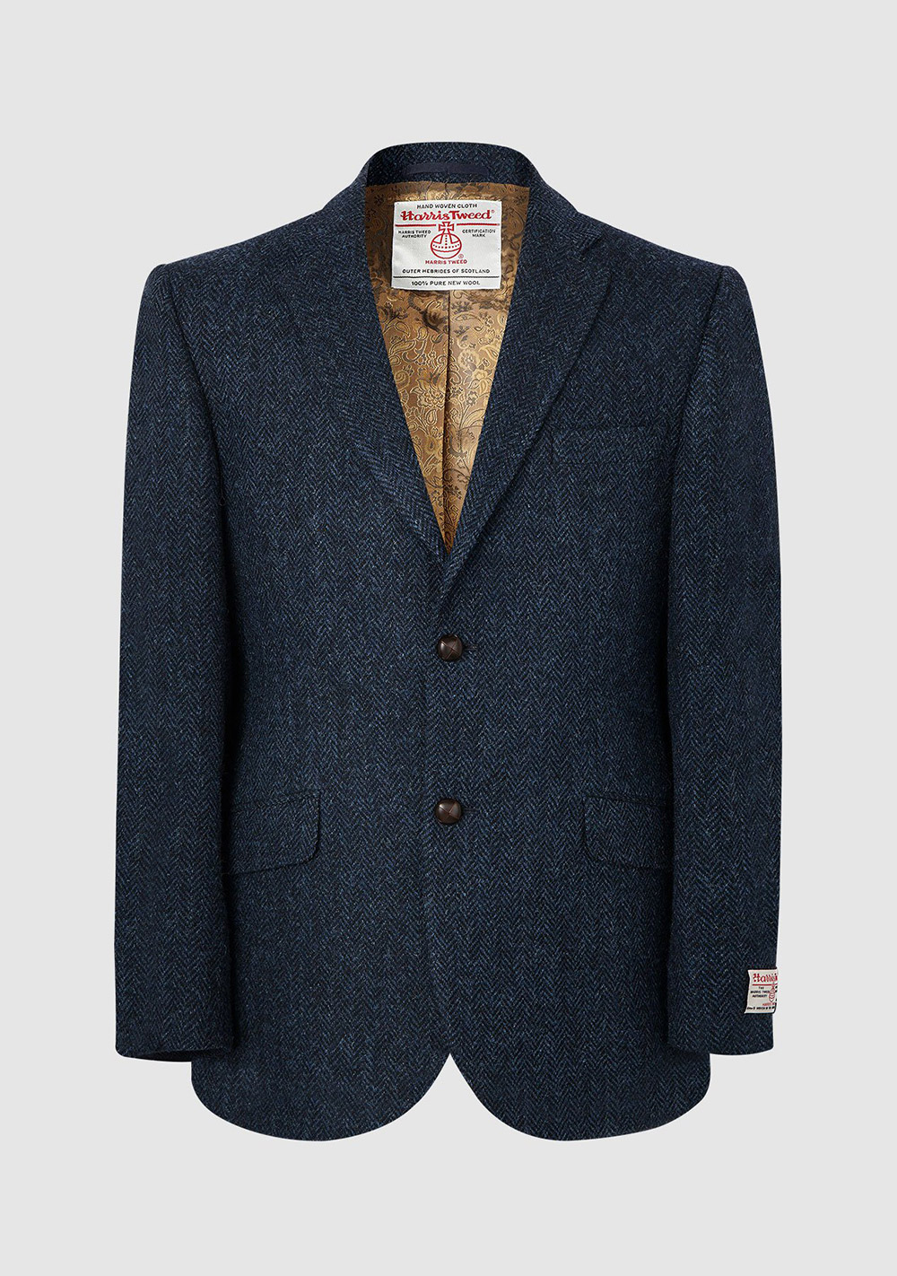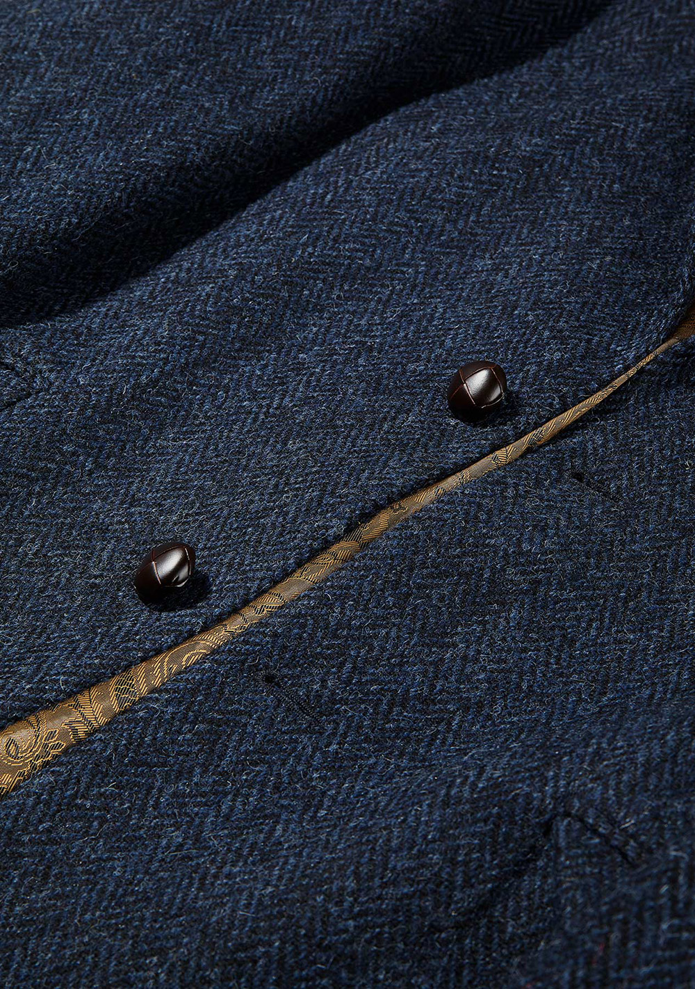 Marynarka Bucktrout Patrick Navy Herringbone została uszyta z tweedu Harris, który jest tkany ręcznie na wyspach znajdujących się na północ od kontynentalnej części Szkocji. Nie jest zbyt przyjemny w dotyku, ale jest bardzo ciepły i niezwykle wytrzymały. Podszewka tej marynarki została wykonana z wyrazistego sztucznego materiału ze szkarłatnym wzorem paisley; składa się z acetatu i wiskozy i cechuje się wysoką trwałością.
